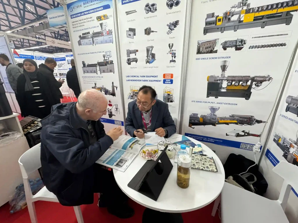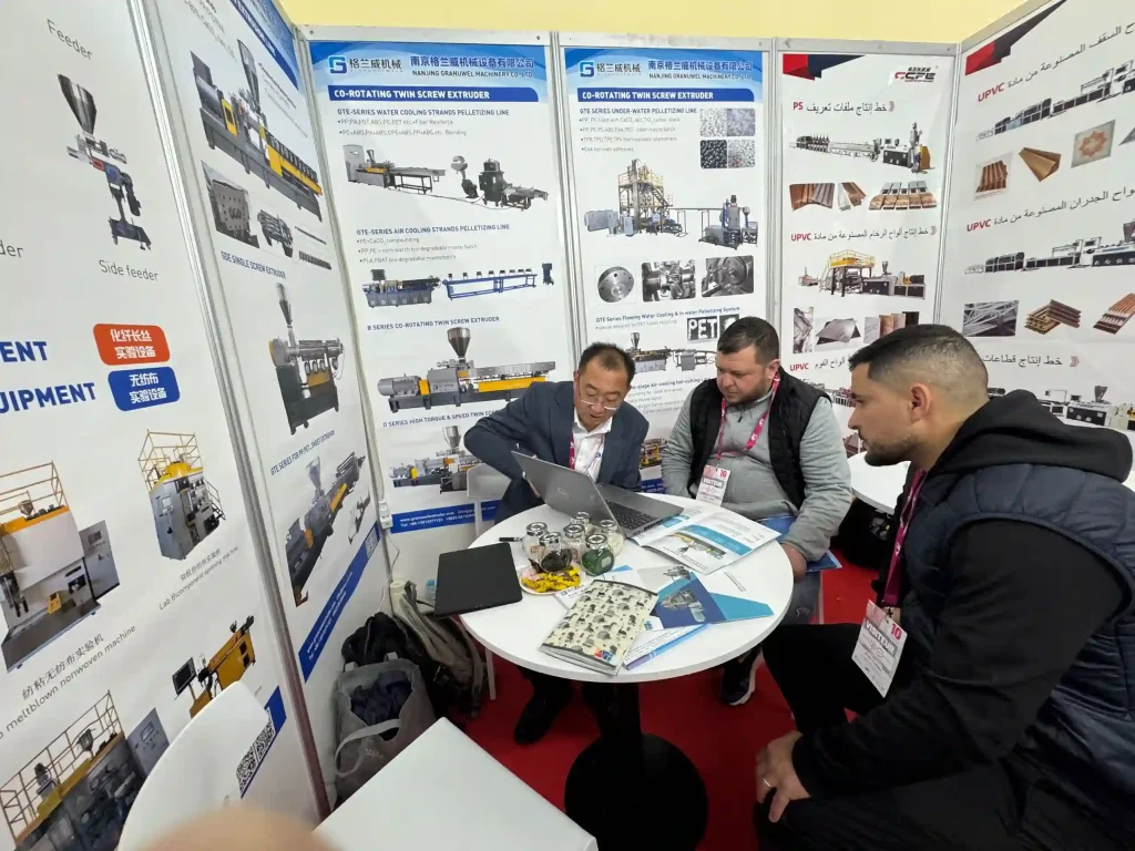 南京格兰威机械有限公司于2026年3月30日至4月1日,参加了在阿尔及尔SAFEX展览中心举办的第十届阿尔及利亚国际塑料橡胶展(Plast Alger 2026),展位号为A-Q22。本次参展我们主要展示了高性能螺纹元件和多系列色母粒样品。三天展期内,前来展位交流的专业观众数量超出预期,其中不少人带着具体的生产问题而来。